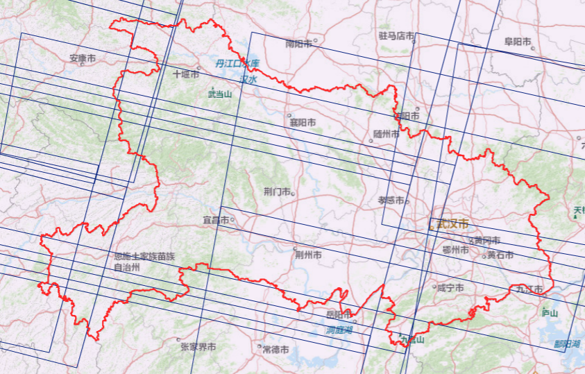 高分二号卫星数据新增174景(如图3所示),覆盖范围较小,其中包括荆门市、十堰市、孝感市、襄阳市等部分区域。大部分地区数据质量较好,有少量云层覆盖。